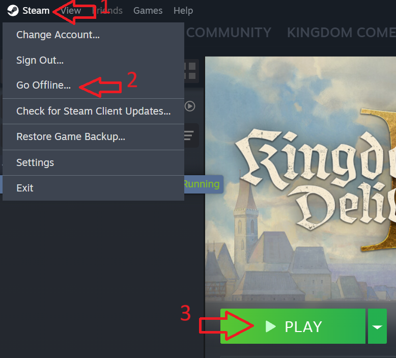 Una volta installato il gioco, clicca su "Steam" nell'angolo in alto a sinistra, quindi seleziona "Passa offline". Ora puoi giocare senza connessione a Internet.